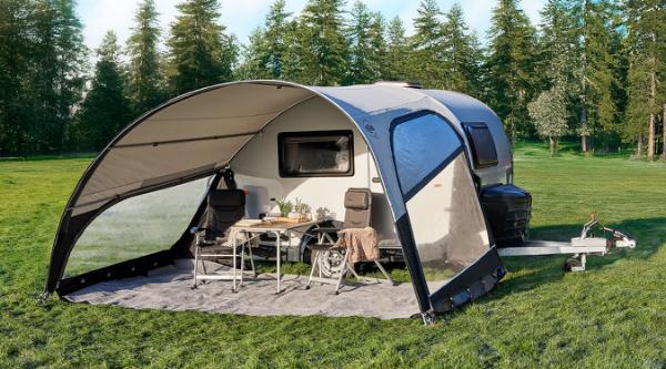 Das T@B Sonnendach Plus wurde speziell für die einzigartige Form des T@B Wohnwagens entworfen und bietet viel Schatten und Schutz in einem stilvollen und funktionellen Design. Für ein gutes Raumgefühl sorgt die Tiefe von 250 cm.