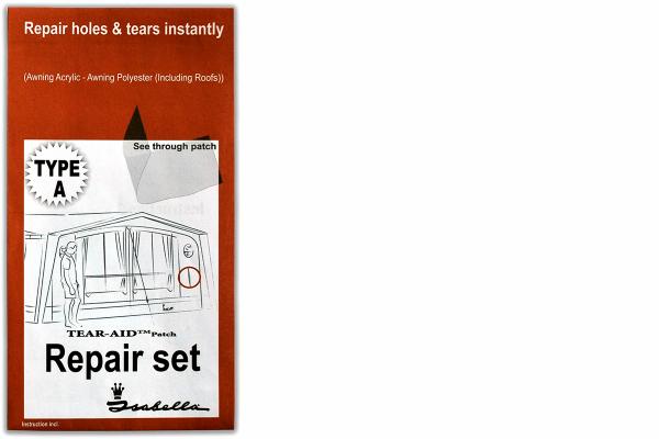 Isabella reparasjonssett til fortelt. Lappene er gjennomsiktige. Type A er til akryl, som for eksempel takduken. Fås også i Type B til PVC.