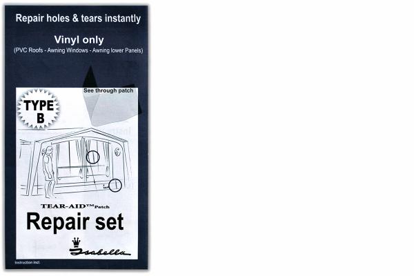 Isabella reparasjonssett til fortelt. Lappene er gjennomsiktige. Type B er til PVC, spesielt utviklet til reparasjon av vinduer, PVC-tak og nedre paneler på fortelt. Fås også i Type A til akryl.