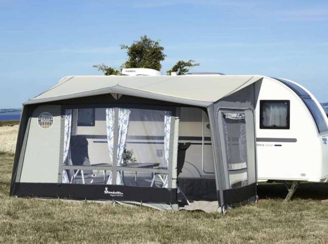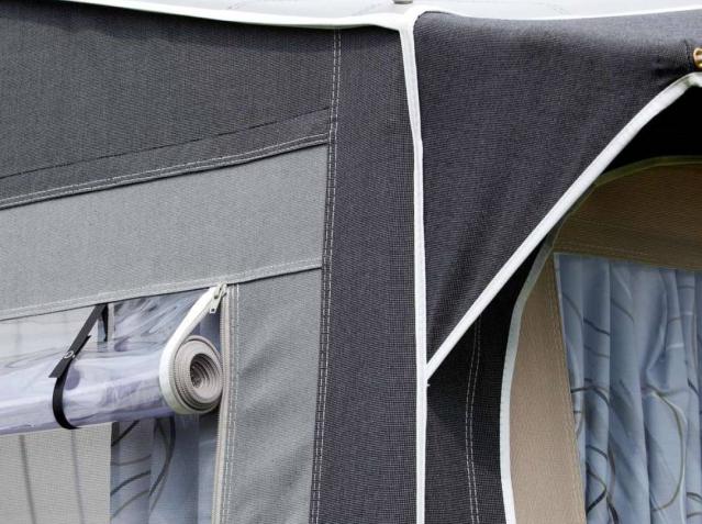 The double connection wing is designed to ensure that the awning has a completely tight connection to the caravan. This prevents draughts, wind, and rain from entering the awning.
