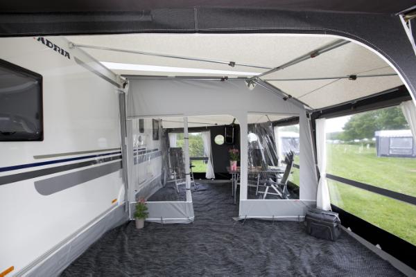 Coated polyester partition wall for Penta. When you wish to use the full width of the awning, the entire inner panel can be zipped out. Optional curtain can be hung directly on the partition wall using curtain clips (optional extra).